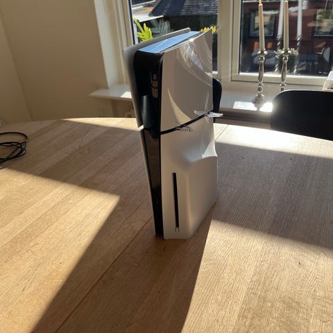 Playstation 5 spillekonsol med hvidt og sort design. Konsollen er beregnet til gaming og underholdning.