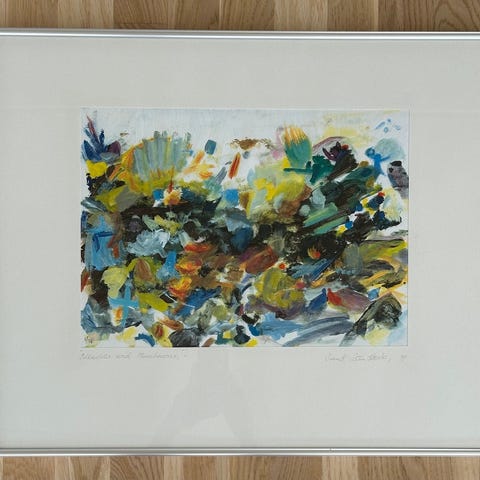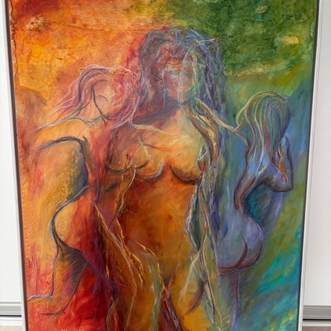 Peer Lundbæk maleri med abstrakt motiv og indlagt bark. Maleriet er indrammet og har en farvepalette med røde, gule og brune nuancer. Maleriets dimensioner er 80x60 uden ramme.