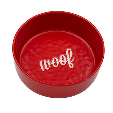 Giv din hund mad med stil med denne dejlige Woof Hundemadskål, med motiv af forskellige hunde. Skålen har gummibeklædning rundt om bunden, så den ikke glider når hunden spiser.