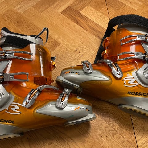 Gule skistøvler til alpinski med 4 låsespænder og velcrorem.