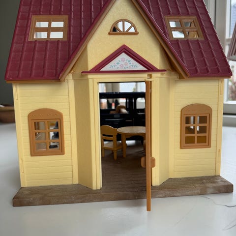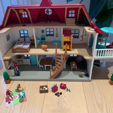Schleich dukkehus med flere rum, vinduer og tilhørende møbler ( både orginale og ikke), dyr samt en lille bil. Dukkehuset er designet til leg og opbevaring af tilbehør og figurer.