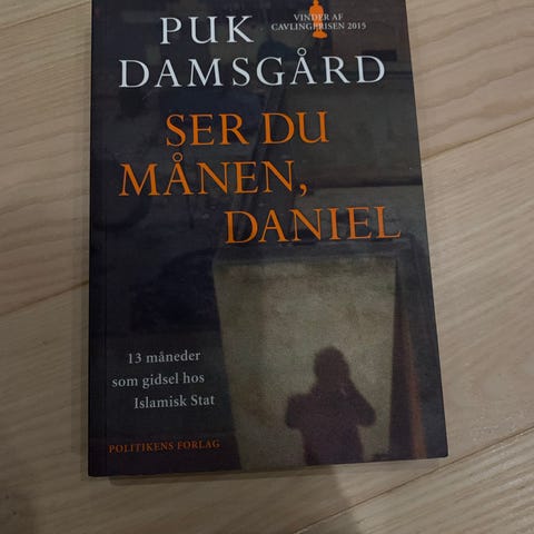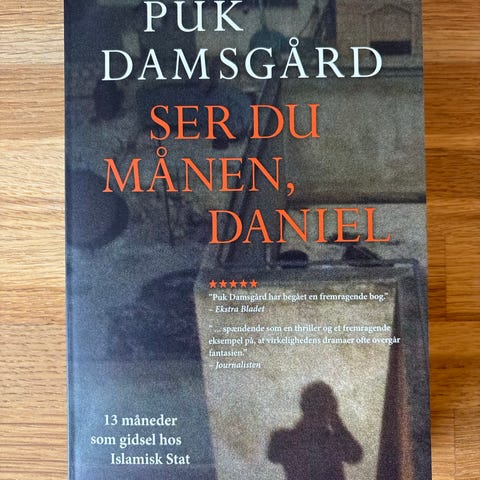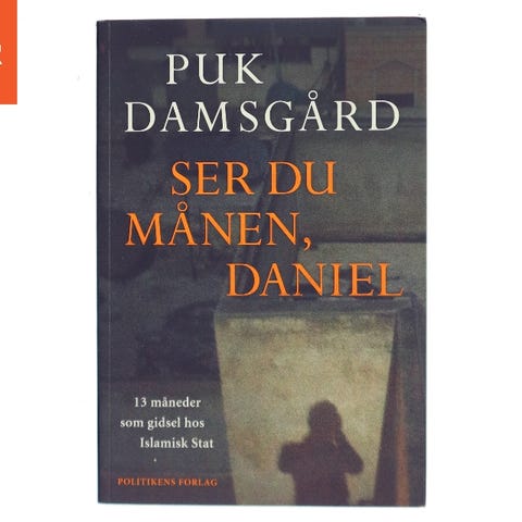 Puk Damsgård 'Ser du månen, Daniel'. Paperback. Bogen beskriver 13 måneder som gidsel hos Islamisk Stat, med fokus på forfatterens personlige oplevelser og fortællinger.
