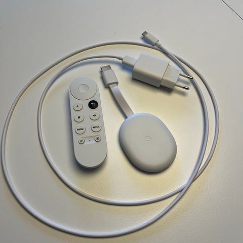 Google Chromecast med strømforsyning og HDMI kabel til tilslutning.