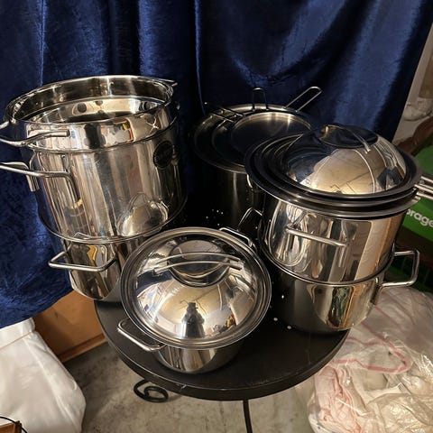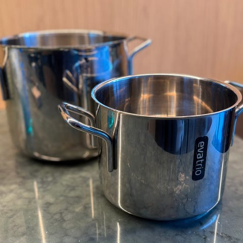 Eva Solo grydesæt i rustfrit stål bestående af flere gryder i forskellige størrelser.