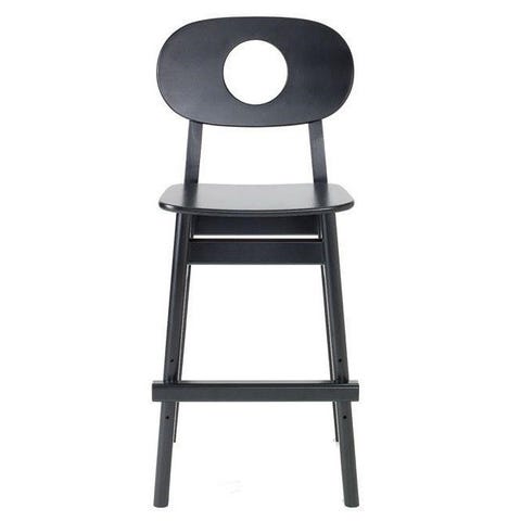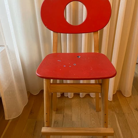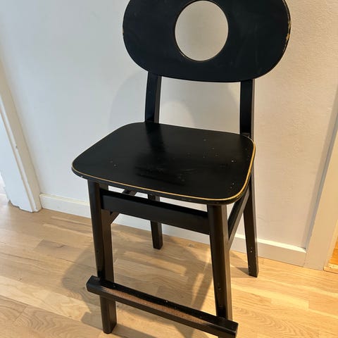 Sort med slidt maling hist og her. Siddehøjde 53 cm, men fodstøtten kan placeres i 4 forskellige højder så stolen vokser med barnet. Kan afhentes i Pilegårdskvarteret alle dage.