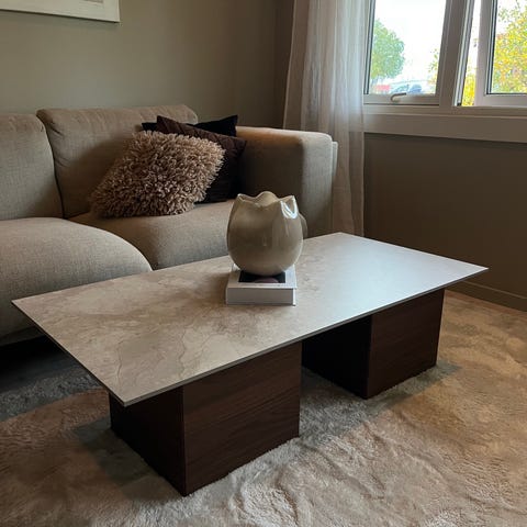 IKEA Achille Castiglioni sofabord med sort marmorplade med hvide årer og guldfarvet metalstel. Bordet har et moderne design med en firkantet bordplade og et geometrisk stel. Velegnet til opholdsrum som stue.