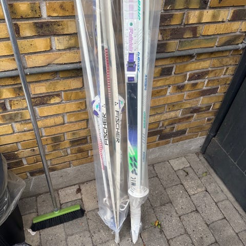 Fischer Langrendsski sæt med to par ski i farverne gul og rød. 140 og 156 cm.