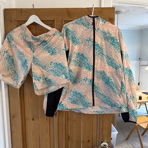 The North Face løbejakke til herre i størrelse L. Jakken er grå og sort og designet til løb.
