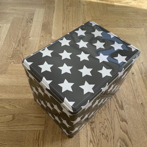 Tre rummelige metal opbevaringsdåser i retrostil med et sort skrivefelt til kridt på fronten.