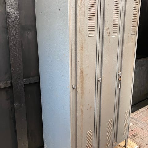 Skab i metal med lås. Skabet har en mørk farve og er designet til opbevaring med mulighed for at låse døren. Velegnet til opbevaring af personlige ejendele eller arbejdsudstyr.