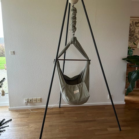 Hængekøje med motoriseret løftemekanisme i beige. Produktet er designet til indendørs brug og kan hænges op i loft eller dørkarm. Motoren styrer løft og sænkning af hængekøjen, som er lavet af tekstilmateriale i en neutral beige farve.