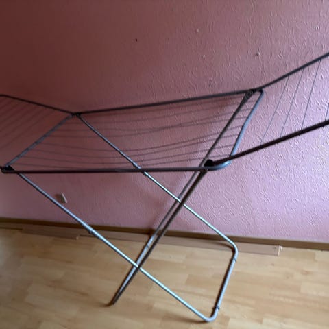 Tørrestativ med 16 meter tørreplads, der kan rumme 1-2 vaske. Hvid stålramme med blå udfoldelige vinger i plast, der kan holde det lange vasketøj. Med praktiske holdere til småt vasketøj, såsom sokker. Dets robuste parallelle ben sikrer stabilitet, mens den smalle bredde gør den nem at få gennem døråbninger. Sammenklappeligt for nem opbevaring. B55 x L167 x H87/107 cm.