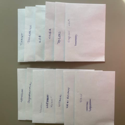 Indeholder forskellige størrelser, farver og motiver fra flere lande.