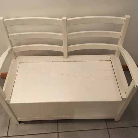 Kåre klint børnebænk med opbevaringsrum i hvid. Bænken har armlæn og ryglæn samt et låg, der kan åbnes for adgang til opbevaringsrummet under sædet. Egnet til børneværelser til opbevaring af legetøj eller andre småting.