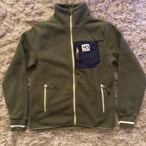 Kari Traa fleecejakke i størrelse XS. Jakken er hvid med navy detaljer, herunder brystlomme med lynlås og ribkanter ved ærmer og kant. Materialet er fleece, og designet er unisex. Brugt få gange af vores barn, som mellemlag under skijakke. Ingen synlig slidtage. Kan afhentes på Østerbro. Se også vores andre annoncer med skitøj til børn
