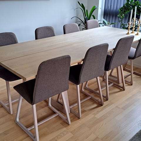 Skovby spisebord i sæbebehandlet bøg med udtræksfunktion til 2 ekstra plader. Der følger 6 stole med, samt 4 stk ekstra der har lidt andet sædebetræk og er ældre