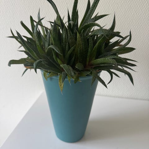 Zimmerpflanze med grønne blade i blå keramikpotte
