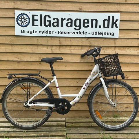 Fin børnecykel med 24" hjulstørrelse, udstyret med for- og bagkurv. Lås og ringeklokke medfølger.