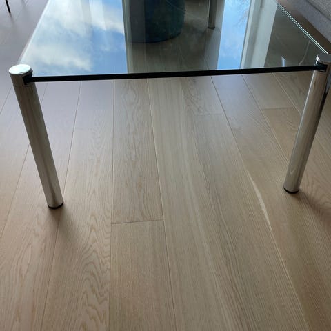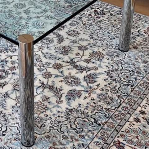 Smukt designer sofabord. Bordplade af gråt glas. Fod af børstet stål.