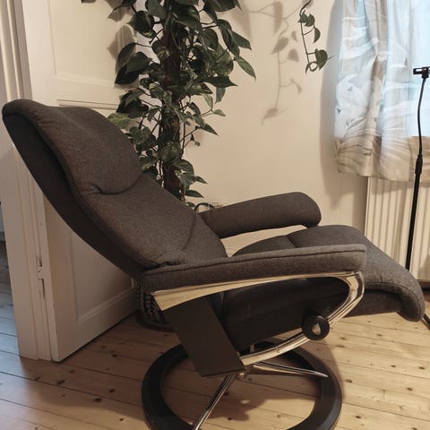 Super skøn lænestol fra stressless, købt hos Moblér i 2022. Stort stel, sort drejefod. Inkl. skammel.
