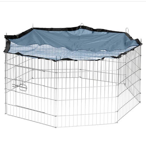 Metalbur til kaniner og smådyr, velegnet til udendørs brug. Buret har en gitterstruktur, der sikrer ventilation og mulighed for indsyn. Det kan anvendes til midlertidig indhegning eller ophold for kæledyr som kaniner.