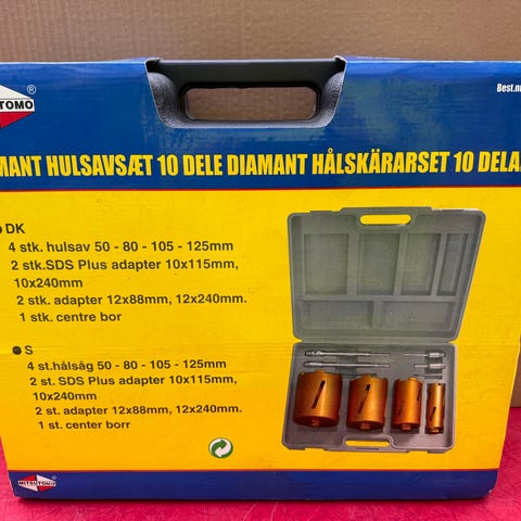 Boxer hulsavssæt med 11 dele. Sættet indeholder forskellige størrelser hulsave i orange farve, opbevaret i en sort og gennemsigtig plastkasse.