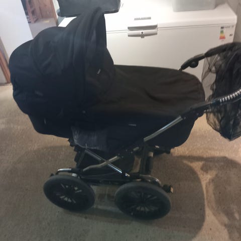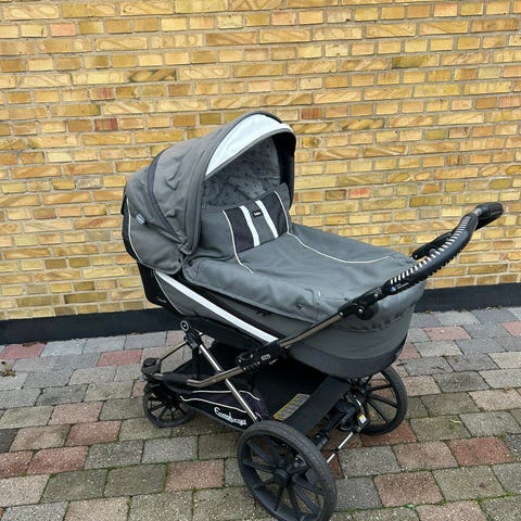 Flot og velholdt emmaljunga barnevogn. Vognen har indbygget fluenet og solsejl. Der medfølger lift,madrasser og sele.