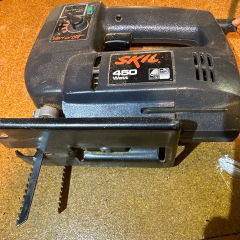 Buget stiksav med elektrisk drift. Værktøjet har et håndtag til betjening og en ledning til strømforsyning. Designet til savning af forskellige materialer ved hjælp af en frem-og-tilbagegående klinge.