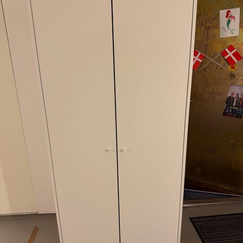 Praktisk garderobe fra Ikeas Kleppstad serie i hvid. 3 døre med hylder til højre og plads til at hænge tøj til venstre. Minimale brugssport med 2 små ridser længst bag i skabet.