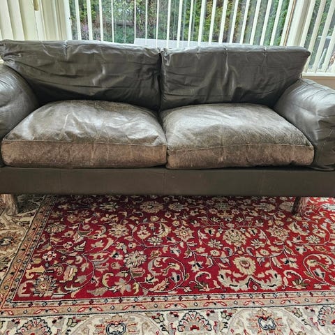 Sædet er revnet i det sorte læder og sælges derfor til restaurering.
