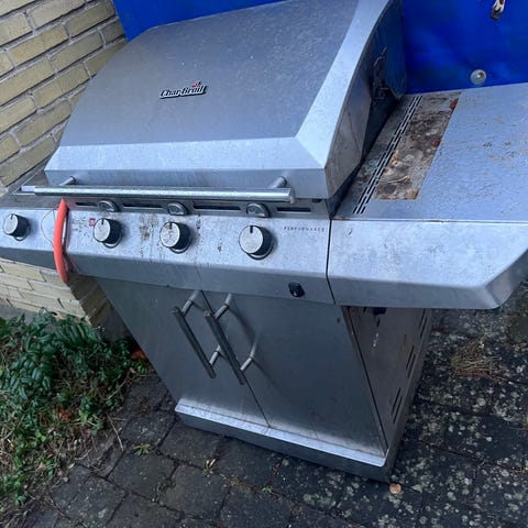Char-Broil gasgrill i rustfrit stål med 4 brændere. Grillen har låg og opbevaringsskab under grillfladen. Velegnet til udendørs madlavning og grillning.