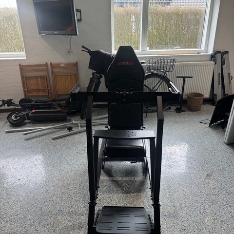 Sim rig med løs sæde. Bremse pedal har fejl, som måske kan fixes med en software opdatering. Der er skiftet loadcell i bremsepedalen.
