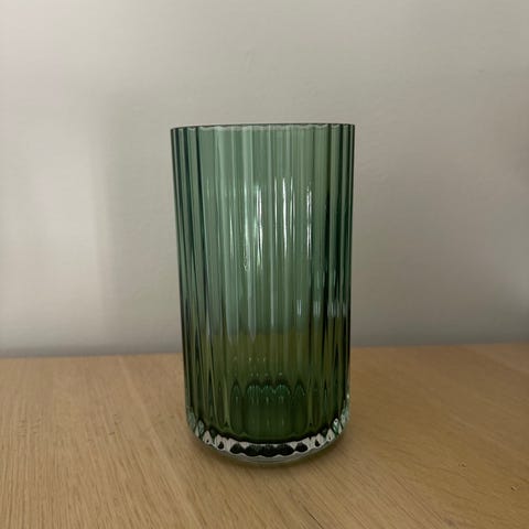 Lyngby Vase i 20 cm højde lavet af grøn glas. Vasen har et klassisk, ribbet design og er egnet til dekoration med blomster eller som dekorativ genstand.