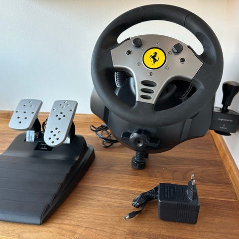 Thrustmaster Ferrari Racing Wheel GT Cockpit racerrat med pedaler. Inkluderer rat med Ferrari-logo, gearskifte og multifunktionelle knapper. Komplet med tilhørende pedaler og justerbart stativ. Designet til racing-simulationsspil. Skal afhentes i Kastrup