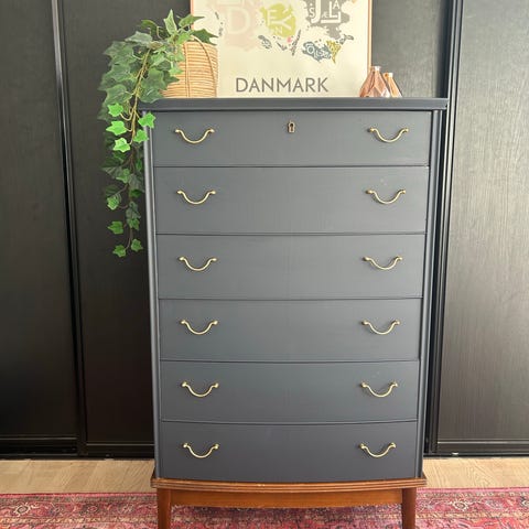 Rummelig, klassisk kommode med guldhåndtag, nymalet i lys støvet grøn