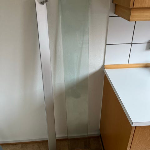 Glassets tykkelse er 1,2 cm og alu skinnen på væggen er 7 cm (mod væggen). På undersiden er der en mindre flig som er slået af. Deraf lav pris. Ny pris i butik er ca 3700kr.