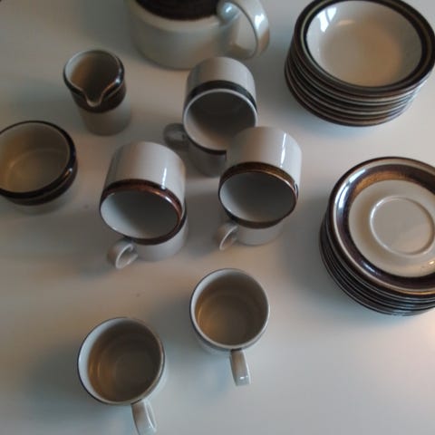 Har 7 kopper, 8 underkopper og 7 tallerkener.