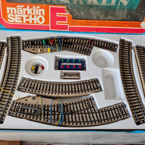Stor bane med mange skinner, lokomotiver, vogne og huse. Transformator virker ikke og derfor kan jeg ikke garanter at toge kan køre.