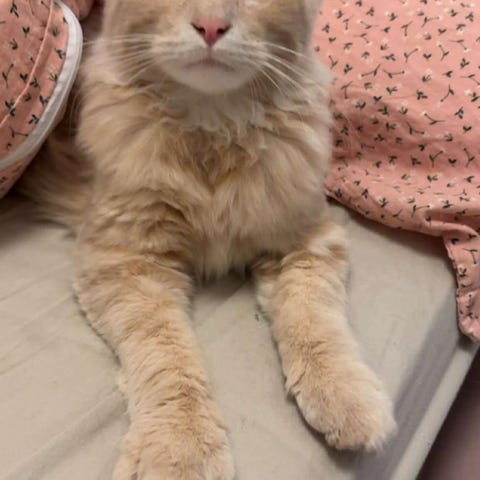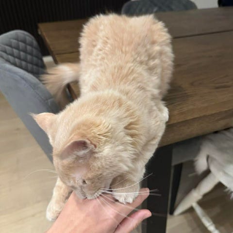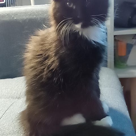 Han bliver håndteret hver dag, er vant til hverdagens lyde, andre katte, hund og små børn. Han er en tryg, nysgerrig og kærlig fyr med et roligt sind og et glimt i øjet.