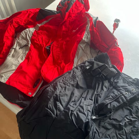 Fuld jakke med sort inder flisjakke der kan lynes af hvis det er varmt. Kan bruges som selvstændig flisjakke. Ved varmt vejr kan skijakken benyttes som skaljakke, uden sort inder jakke. Ny pris 5998kr. Leveres gratis i Roskilde, Greve og Tåstrup. Skibukser i rød haves med sorte seler og bælte. Ikke købt som sæt, og lille farve nuance.