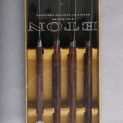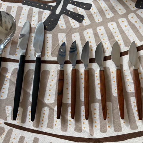 10 lækre bordknive i rustfrit stål med træskafter - jeg tror, det er teak. Det hedder Eton og er designet for Raadvad af Henning Nørgaard. Der er 6 med lidt skær og 4 uden. De fire i æsken (uden skær) ser stort set ubrugt ud. De 6 andre har jeg givet olie og de er lidt uens i overfladen af træet. Længde 21,5 cm.