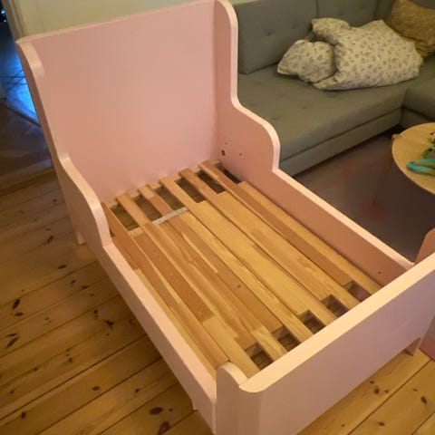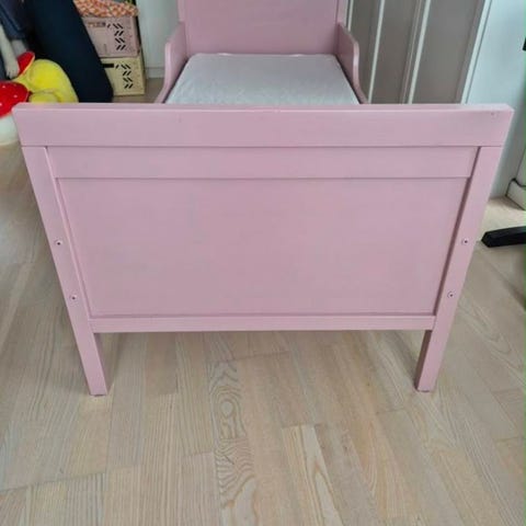 Lyserød Busunge seng fra IKEA. Den kan indstilles til 130 cm, 160 cm og 200 cm.