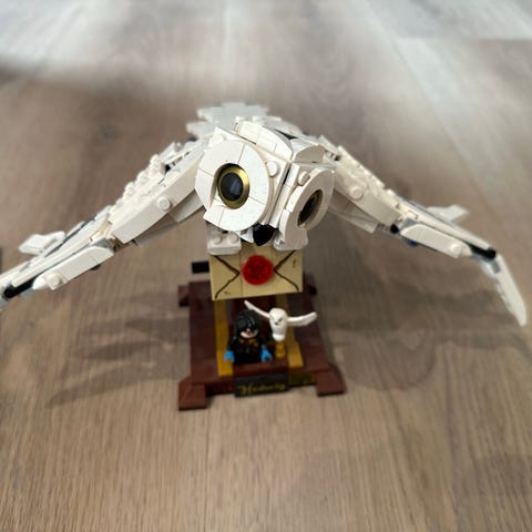 LEGO Harry Potter Hedwig model. En detaljeret LEGO-model af uglen Hedwig fra Harry Potter-serien, monteret på en stander med et brev. Modellen er designet til samling og udstilling.
