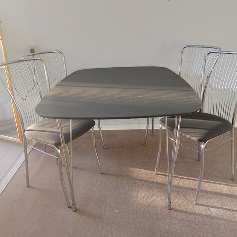 Spisebordsæt med 4 sorte stole og et spisebord i træ (malet over i lys grå). Har et par ridser og en af stolene mangler en skrue, ellers i fin stand.