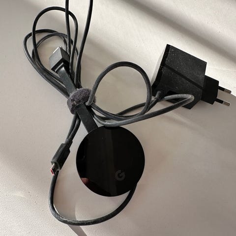 Google Chromecast 4K med fjernbetjening og opladerkabel.