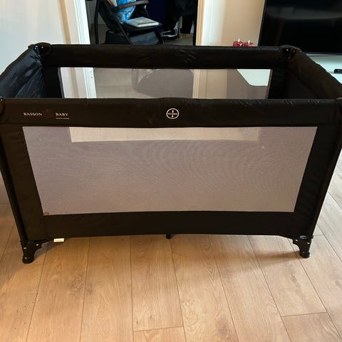 Basson Baby - Weekendseng/rejseseng med madras. Praktisk rejseseng. Fylder minimalt sammenklappet. Inkl. bund og sort madras. Mål: 60x120 cm. Farve:sort. //brugsspor og stoffet på madrassen trænger til en vask - kan lynes af.