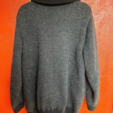 Léttlopi striktrøje i størrelse 3XL, farven er grå. Trøjen er håndstrikket med mønsterdetaljer i en mørkere farve omkring hals, ærmer og bund. Materialet består af uldgarn, hvilket giver varme og komfort. Velegnet til mænd.