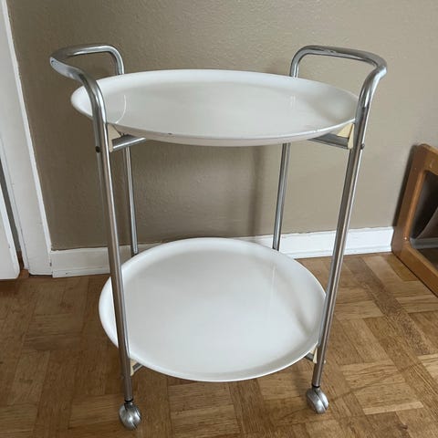 Vintage tysk bakkebord med to melamin bakker/plader i hvid. Flot krom stel og krom hjul.