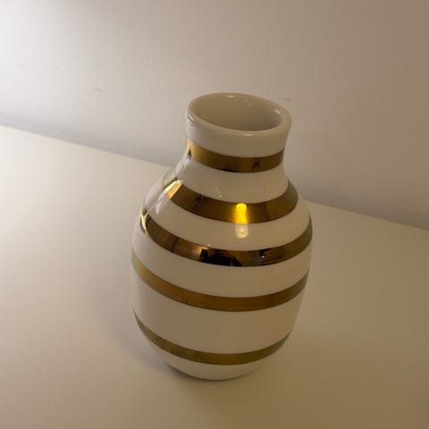 Kähler vase med guldstriber i keramik. Vasen har en rund form med en smal åbning og er dekoreret med horisontale guldstriber på en hvid baggrund.