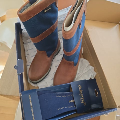 Vi har solgt båden og har to par næsten nye Dubarry Ultima sejlerstøvler (goretex) i størrelse 7,5/41 og str. 8,5/42-43.